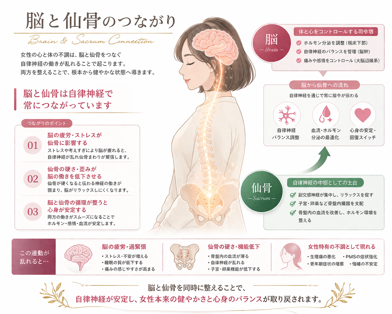 脳と仙骨はどちらも女性の不調と深く関係していると言われ、この2つを整えることで脳を含めた全身の血流量が増え、自律神経のバランスと骨盤機能を高めることができます。