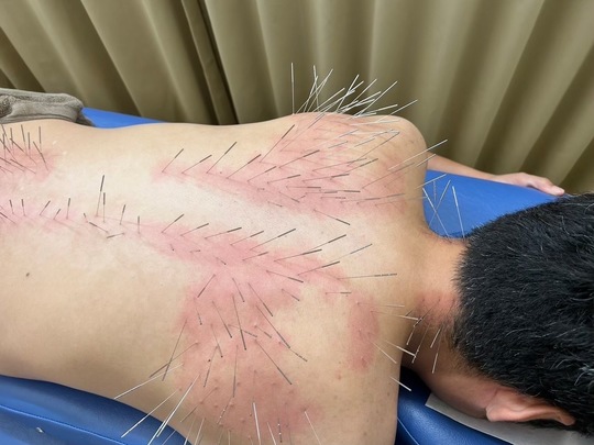 一般的な鍼よりも太めの鍼を200本~400本程使用し体に蓄積したコリを確実に緩めていきます。太めの鍼なので刺鍼時に痛みを伴うことが多々ありますが身体が治るのに必要な刺激と考えております。多少痛くても自分の体を本気で治したいという方向けの治療です。