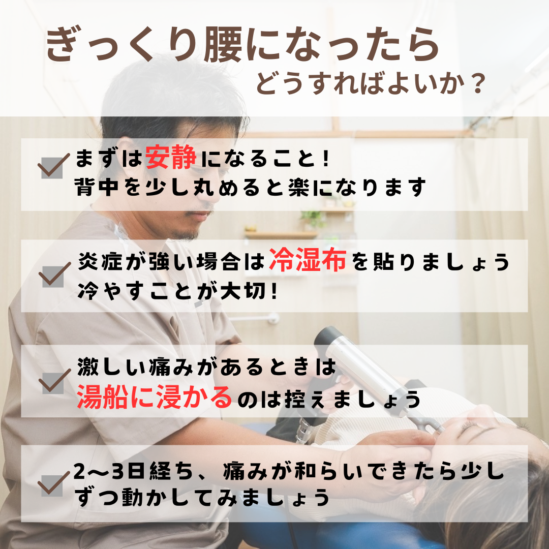 ギックリ腰は瞬間的な激しい痛みに襲われ、ひどい方だと動くこともできない強い痛みが生じます。通常は数日から10日ほどで完治しますが、2週間以上痛みが続く場合や、足が痺れるなどの症状があればレントゲンやMRIを撮っていただくことをおすすめいたします。